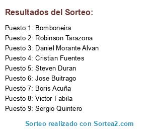 Lista de participantes: Daniel Morante Alvan, Cristian Fuentes, Boris Acuña, Steven Duran, Jose Buitrago, Victor Fabila, Bomboneira, Sergio Quintero, Robinson Tarazona.
