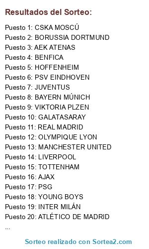 Lista de participantes: FC BARCELONA, ATLÉTICO DE MADRID, REAL MADRID, VALENCIA, BAYERN MÚNICH, SCHALKE 04, HOFFENHEIM, BORUSSIA DORTMUND, MANCHESTER CITY, MANCHESTER UNITED, LIVERPOOL, TOTTENHAM, JUVENTUS, NÁPOLES, ROMA, INTER MILÁN, PSG, MÓNACO, OLYMPIQUE LYON, LOKOMOTIV MOSCÚ, CSKA MOSCÚ, PORTO, SHAKHTAR DONETSK, BRUJAS, GALATASARAY, VIKTORIA PLZEN, PSV EINDHOVEN, ROSEMBORG, AEK ATENAS, YOUNG BOYS, AJAX, BENFICA.