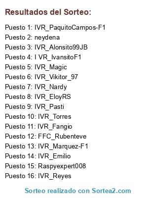 Lista de participantes: IVR_PaquitoCampos-F1, FFC_Rubenteve, Raspyexpert008, IVR_Fangio, IVR_Alonsito99JB, IVR_Magic, IVR_Vikitor_97, I VR_IvansitoF1, IVR_EloyRS, IVR_Emilio, IVR_Reyes, IVR_Marquez-F1, IVR_Torres, IVR_Nardy, IVR_Pasti, neydena.