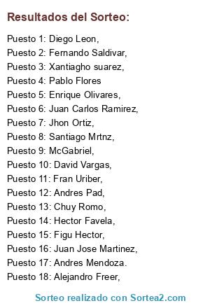 Lista de participantes: Pablo Flores, Alejandro Freer,, McGabriel,, Hector Favela,, Andres Pad,, Juan Jose Martinez,, Enrique Olivares,, David Vargas,, Santiago Mrtnz,, Diego Leon,, Jhon Ortiz,, Fran Uriber,, Fernando Saldivar,, Xantiagho suarez,, Chuy Romo,, Juan Carlos Ramirez,, Figu Hector,, Andres Mendoza..