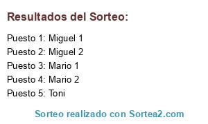 Lista de participantes: Miguel 1, Mario 1, Toni, Miguel 2, Mario 2.