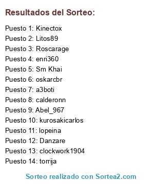 Lista de participantes: Kinectox, Abel_967, torrija, enri360, Sm Khai, a3boti, clockwork1904, calderonn, lopeina, oskarcbr, Litos89, kurosakicarlos, Roscarage, Danzare.