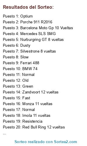 Lista de participantes: Barcelona Moto Gp 10 Vueltas, Brand Hatch 13 Vueltas vueltas, Imola 11 vueltas, Laguna Seca 13 vueltas, Monza 11 vueltas, Mugello 10 vueltas, Nurburgring GT 8 vueltas, Red Bull Ring 12 vueltas, Silvestrone 8 vueltas, Zandvoort 12 vueltas, BMW 74, Ferrari 488, Mclaren MCP4-12C, Mercedes SLS SMG, Nissan GT-R, Porche 911 R2016, Audi R8, Corvette GT3, Normal, Normal, Normal, Resistencia, Dusty, Old, Slow, Green, Fast, Optium.