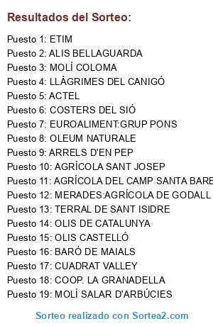 Lista de participantes: ACTEL, AGRÍCOLA DEL CAMP SANTA BARBARA, AGRÍCOLA SANT JOSEP, ARRELS D'EN PEP, BARÓ DE MAIALS, COOP. LA GRANADELLA, COSTERS DEL SIÓ, CUADRAT VALLEY, ETIM, EUROALIMENT:GRUP PONS, LLÀGRIMES DEL CANIGÓ, MERADES:AGRÍCOLA DE GODALL, MOLÍ COLOMA, MOLÍ SALAR D'ARBÚCIES, OLEUM NATURALE, ALIS BELLAGUARDA, OLIS CASTELLÓ, OLIS DE CATALUNYA, TERRAL DE SANT ISIDRE.