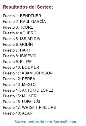Lista de participantes: ADAN, HART, ANTONIO LÓPEZ, FILIPE, PEREA, GODÍN, TOURÉ, UJFALUŠI, ADAM JOHNSON, MILNER, WRIGHT-PHILLIPS, RAÚL GARCÍA, MESTO, BODMER, ISSIAR DIA, BENDTNER, AGÜERO, IBISEVIC.