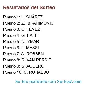 Lista de participantes: L. MESSI , A. ROBBEN , C. RONALDO , Z. IBRAHIMOVIĆ , R. VAN PERSIE , S. AGÜERO , L. SUÁREZ , G. BALE , NEYMAR , C. TÉVEZ.