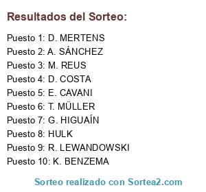 Lista de participantes: E. CAVANI , R. LEWANDOWSKI , T. MÜLLER , K. BENZEMA , G. HIGUAÍN, A. SÁNCHEZ , D. COSTA , M. REUS , HULK , D. MERTENS.