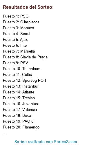 Lista de participantes: Manchester City, Barcelona, Real Madrid, Sevilla, Valencia, Villarreal, Monaco, Lyon, Marsella, PSG, Inter, Roma, Milan, Juventus, Arsenal, Chelsea, Man Udt, Liverpool, Leverkusen, Munich, Dormunt, Schalke, Ajax, PSV, Slavia de Praga, Botafogo, Flamengo, Porto Alegre, Oporto, Benfica, LA Galazy, Celtic, Atlante, AEK, Boca, River, Corintias, PAOK, Olimpiacos, Panatinaikos, Napoles, Besiktas, Fenerbaxe, Tottenham, Werder, Stutgard, Leeds, Sydneey, Jeju FC, Seoul, Albacete, Sao Paulo, Santos, Krakow, Sportiog POrt, Lieja, Lille, Rangers, Tigres, Kaizer, Udinese, Treviso, Instanbul, West Ham.