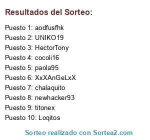 Lista de participantes: chalaquito, UNIKO19, aodfusfhk, Loqitos, XxXAnGeLxX, cocoli16, marlonxito, NDIA055, newhacker93, HectorTony, paola95, titomixx, chicacremita, titonex.