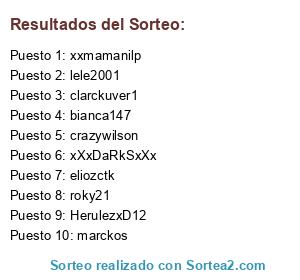 Lista de participantes: bianca147, lele2001, TheKingDanc, fuense, roky21, williams16, darkes5, xxmamanilp, xero182, Smile91, crazywilson, mamakof, mayerli, wilCmd12, darksoner, xXxDaRkSxXx, leandro01345, esfera12, CarlOzxD, marckos, Sany99, messi123, flOreeCiThaa, clarckuver1, Eduardito158, papakof1, eliozctk, 16williams, jjhosesito, HerulezxD12.