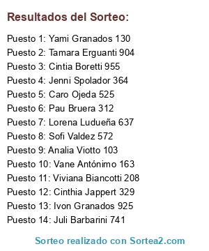 Lista de participantes: Vane Antónimo 163, Analia Viotto 103, Cintia Boretti 955, Ivon Granados 925, Yami Granados 130, Pau Bruera 312, Tamara Erguanti 904, Juli Barbarini 741, Cinthia Jappert 329, Caro Ojeda 525, Lorena Ludueña 637, Jenni Spolador 364, Viviana Biancotti 208, Sofi Valdez 572.
