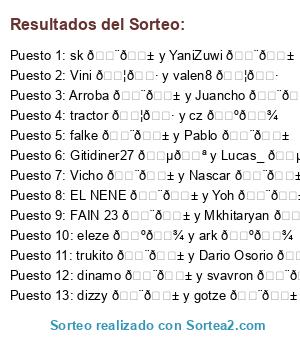 Lista de participantes: trukito 🇨🇱 y Dario Osorio 🇨🇱, Arroba 🇨🇱 y Juancho 🇨🇱, Vini 🇦🇷 y valen8 🇦🇷, tractor 🇦🇷 y cz 🇺🇾, FAIN 23 🇨🇱 y Mkhitaryan 🇦🇷, Gitidiner27 🇵🇪 y Lucas_ 🇵🇪, dizzy 🇨🇱 y gotze 🇨🇱, dinamo 🇨🇱 y svavron 🇨🇱, EL NENE 🇨🇱 y Yoh 🇨🇱, falke 🇨🇱 y Pablo 🇨🇱, sk 🇨🇱 y YaniZuwi 🇨🇱, eleze 🇺🇾 y ark 🇺🇾, Vicho 🇨🇱 y Nascar 🇨🇱.