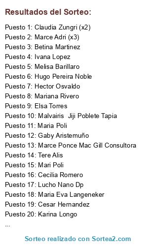 Lista de participantes: Lizi Riv, Maria Poli, Tere Alis, Dami Disipio, Hector Osvaldo, Betina Martinez, Gabriela Zanandrea, Hugo Pereira Noble, Claudia Zungri (x2), Gaby Aristemuño, Mari Poli, Malvairis Jiji Poblete Tapia, Elsa Torres, Cecilia Romero, Kuyen de Plata, Ivana Lopez, Karina Longo, Maria Eva Langeneker, Amanda Roman, Marce Adri (x3), Cesar Hernandez, Melisa Barillaro, Mariana Rivero, Lala Seoane, Daniela Muñoz, Marce Ponce Mac Gill Consultora, Lucho Nano Dp.