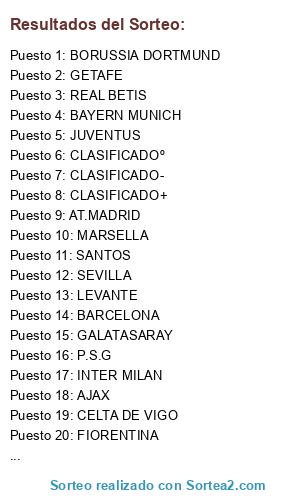 Lista de participantes: BORUSSIA DORTMUND, GETAFE, REAL BETIS, BAYERN MUNICH, JUVENTUS, CLASIFICADOº, CLASIFICADO-, CLASIFICADO+, AT.MADRID, MARSELLA, SANTOS, SEVILLA, LEVANTE, BARCELONA, GALATASARAY, P.S.G, INTER MILAN, AJAX, CELTA DE VIGO, FIORENTINA, R.MADRID, ARSENAL, DEPORTIVO, SCHALKE 04, RAYO VALLECANO, MANCHESTER CITY, ROMA, CHIEVO VERONA, CLASIFICADO^, ATH.BILBAO, AC MILAN, MANCHESTER UNITED.