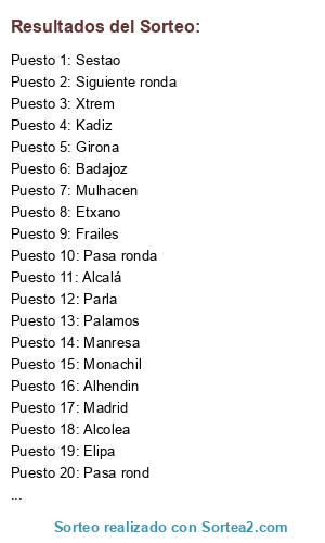 Lista de participantes: Alcalá, Alcolea, Alhambra, Alhendin, Badajoz, Siguiente ronda, Bizkaia, Comillas, Cordoba, Elipa, Elizondo, Etxano, Figueres, Frailes, Getafe, Girona, Granada, Manresa, Kadiz, Madrid, Monachil, Mulhacen, Palamos, Parla, San Fernando, Sestao, Toledo, Vicar, Xixon, Xtrem, Pasa rond, Pasa ronda.