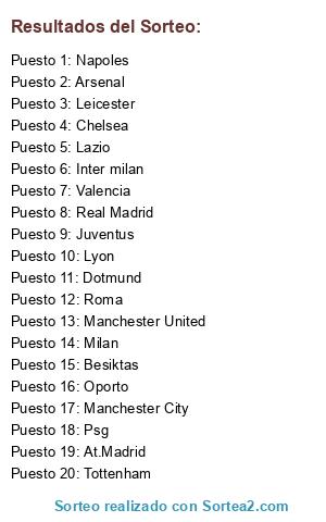 Lista de participantes: Manchester United, Besiktas, Roma, Leicester, Manchester City, Juventus, Oporto, Lyon, Psg, Tottenham, Napoles, At.Madrid, Valencia, Arsenal, Real Madrid, Chelsea, Milan, Dotmund, Inter milan, Lazio.