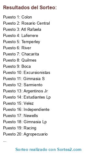 Lista de participantes: Gimnasia Jujuy, Colon, San Lorenzo, Quilmes, Boca, Instituto, San Martin Sj, Racing, River, Almirante Brown, Agropecuario, San Martin T, Atl Rafaela, Estudiantes Lp, Temperley, Atl Tucuman, Independiente, Almagro, Excursionistas, Atlanta, Tigre, Newells, Velez, Argentinos Jr, Gimnasia S, Laferrere, Chacarita, Rosario Central, Sarmiento, Aldosivi, Brown Adrogue, Gimnasia Lp.