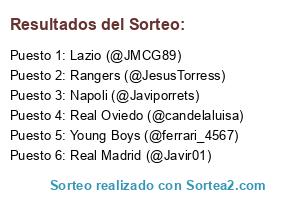 Lista de participantes: Real Oviedo (@candelaluisa), Rangers (@JesusTorress), Real Madrid (@Javir01), Lazio (@JMCG89), Napoli (@Javiporrets), Young Boys (@ferrari_4567).