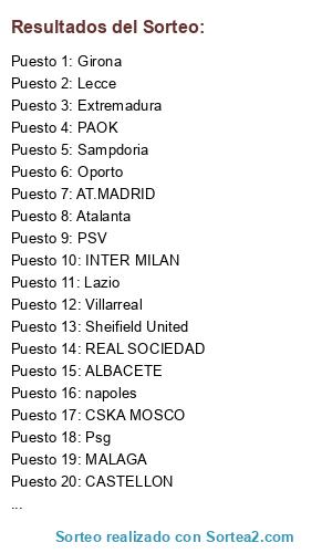 Lista de participantes: ALBACETE, ARSENAL, AT.MADRID, Ajax, Badajoz, Benfica, CASTELLON, CSKA MOSCO, Extremadura, Getafe, Girona, INTER MILAN, LEVERKUSEN, Lazio, MALAGA, MARSELLA, MILÁN, Oporto, PAOK, REAL MADRID, REAL SOCIEDAD, ROMA, Sampdoria, Sheifield United, Tottenham, Villarreal, PSV, napoles, Psg, Atalanta, Fiorentina, Lecce.