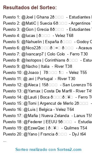 - @Joel | Ghana 2🏅 - Estudiantes RC T41 - @MatiC | Suecia 6🏆 - Argentinos T67