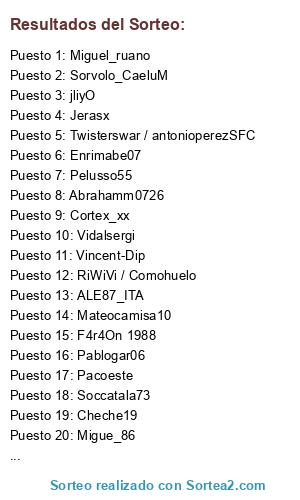 Lista de participantes: Caraplana, Cortex_xx, Vincent-Dip, jliyO, Cheche19, Abrahamm0726, Pelusso55, Sorvolo_CaeluM, Migue_86, Soccatala73, ALE87_ITA, Alberkin, sOmeth1ng/intocable1986, F4r4On 1988, Pacoeste, Enrimabe07, LimbergAVM, Twisterswar / antonioperezSFC, Juan_angel10, Lakylu, Mateocamisa10, Sheriffchenko, RubensFCB, Vidalsergi, Jerasx, miguecs93_CaeluM, Miguel_ruano, Baricelli, VAMOS_VINCENT, RiWiVi / Comohuelo, Pablogar06, Rubenmartin10.