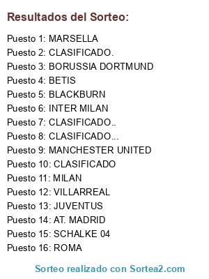 Lista de participantes: BORUSSIA DORTMUND, MARSELLA, AT. MADRID, CLASIFICADO., BLACKBURN, INTER MILAN, SCHALKE 04, CLASIFICADO.., VILLARREAL, JUVENTUS, MILAN, CLASIFICADO..., BETIS, MANCHESTER UNITED, ROMA, CLASIFICADO.