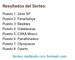 Lista de participantes: Galatasaray, Oporto, Olympiacos, Zenit SP, CSKA Moscú, Fenerbahçe, Panathinaikos, Besiktas.