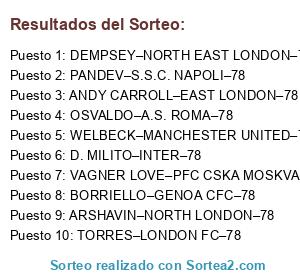 Lista de participantes: ANDY CARROLL–EAST LONDON–78, TORRES–LONDON FC–78, DEMPSEY–NORTH EAST LONDON–78, D. MILITO–INTER–78, PANDEV–S.S.C. NAPOLI–78, WELBECK–MANCHESTER UNITED–78, OSVALDO–A.S. ROMA–78, ARSHAVIN–NORTH LONDON–78, VAGNER LOVE–PFC CSKA MOSKVA–78, BORRIELLO–GENOA CFC–78.