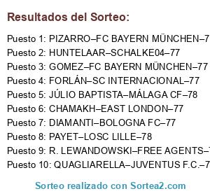 Lista de participantes: PAYET–LOSC LILLE–78, JÚLIO BAPTISTA–MÁLAGA CF–78, DIAMANTI–BOLOGNA FC–77, GOMEZ–FC BAYERN MÜNCHEN–77, QUAGLIARELLA–JUVENTUS F.C.–77, FORLÁN–SC INTERNACIONAL–77, PIZARRO–FC BAYERN MÜNCHEN–77, R. LEWANDOWSKI–FREE AGENTS–77, CHAMAKH–EAST LONDON–77, HUNTELAAR–SCHALKE04–77.