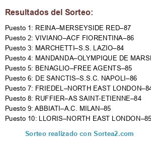 Lista de participantes: REINA–MERSEYSIDE RED–87, VIVIANO–ACF FIORENTINA–86, DE SANCTIS–S.S.C. NAPOLI–86, ABBIATI–A.C. MILAN–85, BENAGLIO–FREE AGENTS–85, MANDANDA–OLYMPIQUE DE MARSEILLE–85, LLORIS–NORTH EAST LONDON–85, MARCHETTI–S.S. LAZIO–84, RUFFIER–AS SAINT-ETIENNE–84, FRIEDEL–NORTH EAST LONDON–84.
