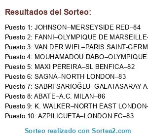 Lista de participantes: K. WALKER–NORTH EAST LONDON–86, ABATE–A.C. MILAN–86, SABRİ SARIOĞLU–GALATASARAY A.S.–85, JOHNSON–MERSEYSIDE RED–84, SAGNA–NORTH LONDON–83, AZPILICUETA–LONDON FC–83, FANNI–OLYMPIQUE DE MARSEILLE–83, MOUHAMADOU DABO–OLYMPIQUE LYONNAIS–83, MAXI PEREIRA–SL BENFICA–82, VAN DER WIEL–PARIS SAINT-GERMAIN–82.