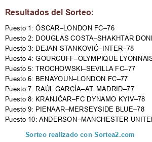 Lista de participantes: GOURCUFF–OLYMPIQUE LYONNAIS–78, PIENAAR–MERSEYSIDE BLUE–78, KRANJČAR–FC DYNAMO KYIV–78, DEJAN STANKOVIĆ–INTER–78, DOUGLAS COSTA–SHAKHTAR DONETSK–78, ANDERSON–MANCHESTER UNITED–77, RAÚL GARCÍA–AT. MADRID–77, TROCHOWSKI–SEVILLA FC–77, BENAYOUN–LONDON FC–77, ÓSCAR–LONDON FC–76.