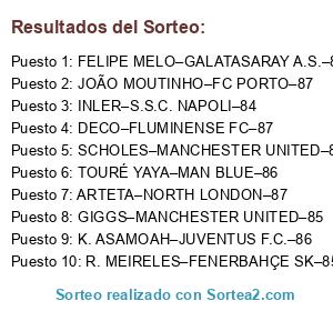 Lista de participantes: DECO–FLUMINENSE FC–87, ARTETA–NORTH LONDON–87, JOÃO MOUTINHO–FC PORTO–87, FELIPE MELO–GALATASARAY A.S.–86, TOURÉ YAYA–MAN BLUE–86, K. ASAMOAH–JUVENTUS F.C.–86, GIGGS–MANCHESTER UNITED–85, R. MEIRELES–FENERBAHÇE SK–85, INLER–S.S.C. NAPOLI–84, SCHOLES–MANCHESTER UNITED–84.