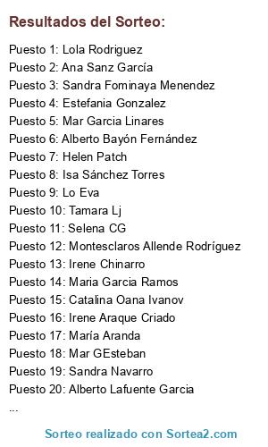 Lista de participantes: Miguel Martín Rodríguez, Sandra Navarro, Beatriz Rueda, Isabel López, Lola Rodriguez, Tamara Lj, Veronica Viñuelas Julio, Paco Naranjo, Isa Sánchez Torres, Oscar Palacios Porrero, Sandra Sandrilu, Miriam Viejo Campo, Sandra Bardo, Sandra Fominaya Menendez, Mar Redondo Gomez, Noelia Salto Gismera, Ana Sanz García, Irene Chinarro, Lorena Garcia Bermudez, Catalina Oana Ivanov, Laura Oliva, María Aranda, Ascen Morena, Mcarmen Arribas Ruiz-medrano, Cris Almenar Villalba, M Angeles Muñoz Rodriguez, Mar GEsteban, Selena CG, Lo Eva, Noelia Garcia Diez, Laura Escobar, Montesclaros Allende Rodríguez, Carmen Martinez Lobo, Manuel Peña Marrero, Estefania Gonzalez, Maria Garcia Ramos, Andrea Roxana, Jessica Fernández Batanero, Alberto Lafuente Garcia, Ameli Lia, Irene Araque Criado, Helen Patch, Mar Garcia Linares, Marta Hernandez Navarro, MCarmen Bermejo Coello, Riansares Lopez, Alberto Bayón Fernández.