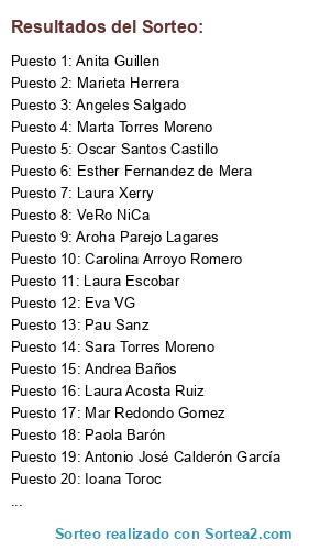 Lista de participantes: Anita Guillen, Aroha Parejo Lagares, Alexandra Rivas Ruiz, Diana Rodriguez Roldan, Eva VG, Paola Barón, Marta Torres Moreno, Marta Pereña Mantilla, Asma Benyamina, Angeles Salgado, Ana B Carramolino, Yoli Valero, Miguel Martín Rodríguez, Isabel López, Carolina Arroyo Romero, Lucia Ruiz Trujillo, Laura Xerry, Antonio José Calderón García, Mar Redondo Gomez, Isa Sánchez Torres, Jen Fer, Carolina Blanco Fernandez, Cristina Ruiz Campillo, Maria Angeles Pintado Pozos, Marieta Herrera, Paloma Micó, Virginia Gil Calvo, VeRo NiCa, Lorena Garcia Bermudez, Ioana Toroc, Laura Ramirez, Ana Garcia Arellano, Sandra Sandrilu, Marta Ortiz Ginestal, Sonia ML, Noelia Sánchez Andrino, Jose Castro Notario, Cristina Marcu, Chony Morena, Oscar Palacios Porrero, Jorge Gomera, Elisangel Marques, Teto Ca A, Sand Rich, Florina Ricean, Sara Torres Moreno, Gema de la Torre, Laura Escobar, Sara Barquilla Vizcaino, Natichu Gil A, Luisiana Solorzano Mora, Cristina CE, B-arbara Ar, Esther Fernandez de Mera, Nere AR, Dalie Rivera Vega, Liceras Gonzalez, Kiny Pinilla, Verónica González Solbes, Yolanda García Arroyo, Patricia Gato Oderiz, Leticia Alarcon del Amo, Javier Fernandez Sanchez, Mamen Peña, Elisabel Hernandez Molano, Vanessa Zaldívar, Bea Heyn, Jorge Santiago, Elena Cañadillas, Andrea Sierra Louzán, Virgy Gutierrez, Emilio Alvarez, Pau Sanz, Soraya Carralero Camacho, Lucía Solaz, Laura Acosta Ruiz, Marta Jimenez, Marina BG, Andrea Baños, Peter HG, Nury Yepayepa Heyhey, Raquel Carrero, Elisa DoHer, Noe San, Carlos A. Plasencia Garcia, Beatriz Millan Antolin, Pascual David Fernandez Ballestrin, Oscar Santos Castillo, Laura PL, Vanessa Varillas.