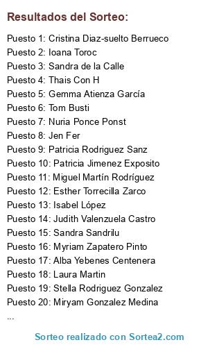 Lista de participantes: Vanessa Silvano, Manuel Romero Diaz, Maria Victoria Morales Vazquez, Helena Romero Alfaro, Paquita Alvarez Alfaro, Almur Dena, Victoria Díaz, Jorge Gomera, Carlos Parras, Carolina Arroyo Romero, Nuria VL, Lorena Garcia Bermudez, Isabel López, Miguel Martín Rodríguez, Coral Rubio, Santiago Mercado Blazquez, Luar Otein Zelg, Cristina Colina Diez, Andrea Roxana, Tanya MG, Yoli Valero, Jose Luis Gonzalez, Jorge Santiago, Ioana Toroc, Ana Belen Aviles Martinez, Sandra Sandrilu, César Cuenca, Jesús Sánchez Camarero, Stella Rodriguez Gonzalez, Alexandra Rivas Ruiz, Laura Acosta Ruiz, BeiTa Cid M, Judith Valenzuela Castro, Ralf Ferndz, Marta Jimenez, Tom Busti, Andrea Rubio Dando, Cesar Cesar Fernandez, Ana Fernández, Anita Dinamita, Marinilla Toledo, Mar Redondo Gomez, Alfonso Herrero Fernandez, Vanesa Agustin Navarro, Olga PG, Sagrario Rodriguez, Marta Rodrigo, Vanesa Prieto, Amanda Garcia, Laura Xerry, Sandra de la Calle, Patricia Rodriguez Sanz, Maricarmen Berbel Roldan, Patricia Gato Oderiz, Elena Navas Moreno, José Alberto Bayón Fernández, Bruno Caceres Bobez, Lourdes Laso, Jose Antonio Prieto Palacios, David Del Olmo Suárez, Maria Balea, Nuria Ponce Ponst, Merche Rubio Sanchez, Ana Belen Fernández Barrero, Arantxa Fuentes, Oscar Palacios Porrero, Maria Muñoz Muñoz, Yolanda Aviles Martinez, Stefy Moya, Rebeca Pajares Ambite, Sheila Plaza, Dew Blacksmith, Jose Mesonero, Beatriz Molina Romero, Nere AR, Alba Yebenes Centenera, Nancy Granda, Paola Bachiller, Soledad Monasterio Alcalde, Chony Morena, Esmeralda Fernandez Arcos, Penelope Sanz, Myriam Zapatero Pinto, Catalina Oana Ivanov, Beatriz Santos Garcia, Beatriz Rueda, Cristina Muro Castillo, Nazareth Martinez Gonzalez, Laura Escobar, Irene Sanz Martin, VeRo NiCa, Jen Fer, Jose Diaz, Laura Martin, Angela Moreno, Laura Ramos, Alejo Miguel González Aza, Diana Argudo, Esther Torrecilla Zarco, Jose Castro Notario, Macarena Garcia Melguizo, Isabel Perez Saez, Silvia Garcia Flores, Laura González Martínez, Sara Martinez, Montesclaros Allende Rodríguez, Jessica Pinzon, Noelia Garcia Diez, Luis Robles, Jose Julian Escudero, Yolanda Ramos Mesa, Thais Con H, Cristina Marcu, Ana Maria Gutierrez Rodriguez, Soraya Carralero Camacho, Nuria Sanz, Isabel Gonzalez, Pilar Martín, Cristina Perez Cardeña, Gema Ramos Martínez, Patricia Jimenez Exposito, Daniel Labajo Diaz, Patricia Carrasco, Elisangel Marques, Gemma Atienza García, Almudena Platas, Cristina Diaz-suelto Berrueco, Eva Iniesta, Verico Vlln, Gema Garcia, Sandra Fominaya Menendez, Miha Mihaela, Isabel Navarro Gonzalo, David Garrido, Maria Bonnin Isasi, Ana Garcia Cuesta, Virginia Laiz, Miryam Gonzalez Medina, Susana Chuska, Alicia Rodriguez-Infantes, Elena VJ, Arancha Alonso, Paloma Milagros, Shoba Mirpuri, Alberto Sanchez, Begoña Rodríguez Lozano, Silvia Movellán Viaña, Araceli Vega Cruz, Raquel Benitez, Silvia Elvira Garcia, Jester Buzon, M Angeles Muñoz Rodriguez, Hyrekia Zelarah, Sonia Gómez Rubio, Paqui Mudriguez, Marta Esteban, Andres Cg.