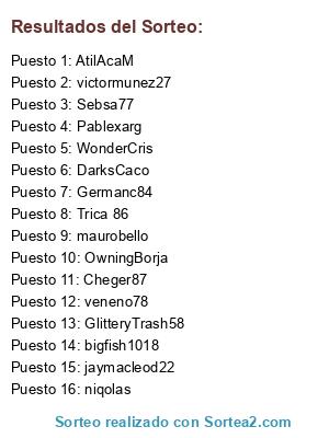 Lista de participantes: Germanc84, Cheger87, Sebsa77, Trica 86, WonderCris, OwningBorja, DarksCaco, niqolas, victormunez27, jaymacleod22, AtilAcaM, maurobello, bigfish1018, GlitteryTrash58, veneno78, Pablexarg.