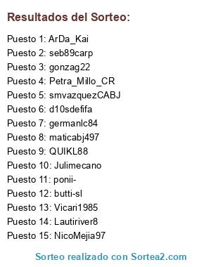 Lista de participantes: gonzag22, Petra_Millo_CR, butti-sl, ponii-, germanlc84, Lautiriver8, Julimecano, seb89carp, QUIKL88, d10sdefifa, NicoMejia97, Vicari1985, maticabj497, ArDa_Kai, smvazquezCABJ.