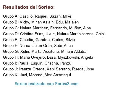 Lista de participantes: Castillo, Alba, Altea, Angela, Muñoz, Bazan, Carlos, Chipi, Claudia, Cristina, Cristina Frias, Edu, Garatea, Fernando, Irantzu Ortega, Iranzu, Aceituno, Javi, Jose, Julen Ortin, Leza, Maialen, Marta, Meri Ansotegui, Maria Ovejero, MIkel, MIriam Aldaba, Mirian Asiain, Moreno, Myszkowski, Naiara Martinez, Naiara Martinicorena, Nerea, Paula, Raquel, Rueda, Luquin, Silvia, Uxue, Vicky, Xabi Serrano, Xabi, Xulin.