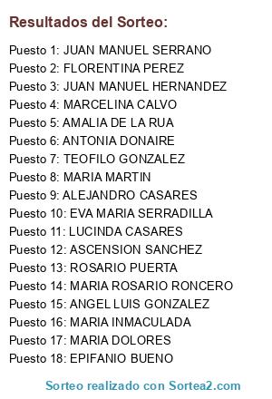 Lista de participantes: ALEJANDRO CASARES , ANTONIA DONAIRE , MARIA MARTIN , MARIA INMACULADA , ROSARIO PUERTA , TEOFILO GONZALEZ , ASCENSION SANCHEZ , JUAN MANUEL HERNANDEZ , MARCELINA CALVO , MARIA DOLORES , EPIFANIO BUENO , LUCINDA CASARES , ANGEL LUIS GONZALEZ , FLORENTINA PEREZ , AMALIA DE LA RUA , MARIA ROSARIO RONCERO , JUAN MANUEL SERRANO , EVA MARIA SERRADILLA.