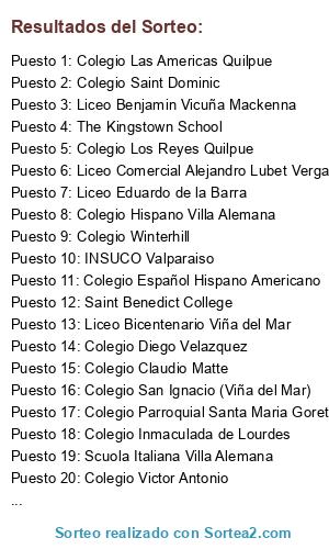 Lista de participantes: Liceo Benjamin Vicuña Mackenna, Liceo Bicentenario Viña del Mar, Colegio Inmaculada de Lourdes, Colegio San Ignacio (Viña del Mar), Saint Benedict College, The Kingstown School, Liceo Parroquial San Antonio, Colegio Claudio Matte, Liceo Jose Cortes Brown, Colegio Español Hispano Americano, Colegio Diego Velazquez, Colegio Juanita Fernández, Colegio Saint Dominic, Colegio Parroquial Santa Maria Goretti, INSUCO Valparaiso, Instituto Tecnico Profesional Maritimo de Valparaiso, Liceo Eduardo de la Barra, Colegio Carlos Cousiño, Colegio Salesiano Valparaiso, Colegio Internacional de Valparaiso, Colegio Alborada de Curauma, Colegio San Damián De Molokai Valparaíso, Colegio Victor Antonio, Liceo Comercial Alejandro Lubet Vergara, Colegio Liahona El Belloto, Colegio Los Reyes Quilpue, Colegio Las Americas Quilpue, Colegio Aconcagua, Colegio Hispano Villa Alemana, Scuola Italiana Villa Alemana, Colegio Tecnico Alianza Educacional de Limache, Colegio Winterhill.