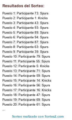 Lista de participantes: Participante 1: Knicks, Participante 2: Knicks, Participante 3: Knicks, Participante 4: Knicks, Participante 5: Knicks, Participante 6: Knicks, Participante 7: Knicks, Participante 8: Knicks, Participante 9: Knicks, Participante 10: Knicks, Participante 11: Knicks, Participante 12: Knicks, Participante 13: Knicks, Participante 14: Knicks, Participante 15: Knicks, Participante 16: Knicks, Participante 17: Knicks, Participante 18: Knicks, Participante 19: Knicks, Participante 20: Knicks, Participante 21: Knicks, Participante 22: Knicks, Participante 23: Knicks, Participante 24: Knicks, Participante 25: Knicks, Participante 26: Knicks, Participante 27: Knicks, Participante 28: Knicks, Participante 29: Knicks, Participante 30: Knicks, Participante 31: Knicks, Participante 32: Knicks, Participante 33: Knicks, Participante 34: Knicks, Participante 35: Knicks, Participante 36: Knicks, Participante 37: Spurs, Participante 38: Spurs, Participante 39: Spurs, Participante 40: Spurs, Participante 41: Spurs, Participante 42: Spurs, Participante 43: Spurs, Participante 44: Spurs, Participante 45: Spurs, Participante 46: Spurs, Participante 47: Spurs, Participante 48: Spurs, Participante 49: Spurs, Participante 50: Spurs, Participante 51: Spurs, Participante 52: Spurs, Participante 53: Spurs, Participante 54: Spurs, Participante 55: Spurs, Participante 56: Spurs, Participante 57: Spurs, Participante 58: Spurs, Participante 59: Spurs, Participante 60: Spurs, Participante 61: Spurs, Participante 62: Spurs, Participante 63: Spurs, Participante 64: Spurs, Participante 65: Spurs, Participante 66: Spurs, Participante 67: Spurs, Participante 68: Spurs, Participante 69: Spurs, Participante 70: Spurs, Participante 71: Spurs, Participante 72: Spurs, Participante 73: Spurs, Participante 74: Spurs, Participante 75: Spurs, Participante 76: Spurs, Participante 77: Spurs, Participante 78: Spurs, Participante 79: Spurs, Participante 80: Spurs, Participante 81: Spurs, Participante 82: Spurs, Participante 83: Spurs, Participante 84: Spurs, Participante 85: Spurs, Participante 86: Spurs, Participante 87: Spurs, Participante 88: Spurs, Participante 89: Spurs, Participante 90: Spurs, Participante 91: Spurs, Participante 92: Spurs, Participante 93: Spurs, Participante 94: Spurs, Participante 95: Spurs, Participante 96: Spurs, Participante 97: Spurs, Participante 98: Spurs.