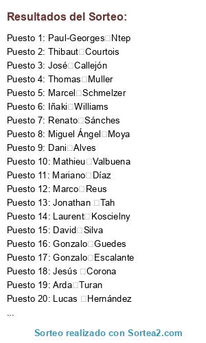 Lista de participantes: Atlético de Madrid Miguel Ángel Moya, Atlético de Madrid Marcel Schmelzer, Atlético de Madrid Dani Alves, Atlético de Madrid Laurent Koscielny, Atlético de Madrid Thomas Muller, Atlético de Madrid Arda Turan, Atlético de Madrid Renato Sánches, Atlético de Madrid José Callejón, Atlético de Madrid Jesús Corona, Atlético de Madrid Victor Wanyama, Atlético de Madrid Jonathan Tah, Atlético de Madrid Aissa Mandi, Atlético de Madrid Anthony Martial, Atlético de Madrid Mathieu Valbuena, Atlético de Madrid Paul-Georges Ntep, Atlético de Madrid Gonzalo Escalante, Atlético de Madrid Philippe Coutinho, Atlético de Madrid Mariano Díaz, Atlético de Madrid Lucas Hernández, Atlético de Madrid Thibaut Courtois, Atlético de Madrid Gonzalo Guedes.