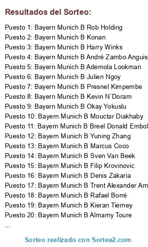 Lista de participantes: Bayern Munich B André Onana, Bayern Munich B Ademola Lookman, Bayern Munich B Mouctar Diakhaby, Bayern Munich B Harry Winks, Bayern Munich B Julien Ngoy, Bayern Munich B Justin Kluivert, Bayern Munich B Marcus Coco, Bayern Munich B Denis Zakaria, Bayern Munich B André Zambo Anguissa, Bayern Munich B Kevin N´Doram, Bayern Munich B Jordan Pickford, Bayern Munich B Mason Holgate, Bayern Munich B Sven Van Beek, Bayern Munich B Yuning Zhang, Bayern Munich B Breel Donald Embolo, Bayern Munich B Trent Alexander Arnold, Bayern Munich B Presnel Kimpembe, Bayern Munich B Rob Holding, Bayern Munich B Derlis González, Bayern Munich B Kieran Tierney, Bayern Munich B Filip Krovinovic, Bayern Munich B Almamy Toure, Bayern Munich B Okay Yokuslu, Bayern Munich B Konan, Bayern Munich B Rafael Borré.