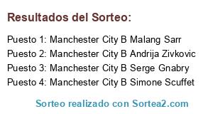 Lista de participantes: Manchester City B Benjamin Henrichs, Manchester City B Theo Hernández, Manchester City B Cesar Montes, Manchester City B Maxime López, Manchester City B Nico Elvedi, Manchester City B Serge Gnabry, Manchester City B André Horta, Manchester City B Gabriel Jesus, Manchester City B Diogo Jota, Manchester City B Ozan Tufan, Manchester City B Cristian Pavon, Manchester City B Jonny Castro Oto, Manchester City B Kenny Tete, Manchester City B Adalberto Peñaranda, Manchester City B Malang Sarr, Manchester City B Martin Odegaard, Manchester City B Simone Scuffet, Manchester City B Andrija Zivkovic, Manchester City B Wylan Cyprien, Manchester City B Riechedly Bazoer.