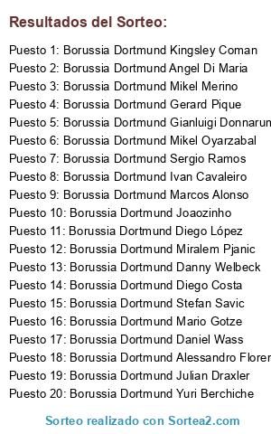 Lista de participantes: Borussia Dortmund Mikel Oyarzabal, Borussia Dortmund Yuri Berchiche, Borussia Dortmund Gerard Pique, Borussia Dortmund Marcos Alonso, Borussia Dortmund Stefan Savic, Borussia Dortmund Alessandro Florenzi, Borussia Dortmund Diego López, Borussia Dortmund Gianluigi Donnarumma, Borussia Dortmund Joaozinho, Borussia Dortmund Julian Draxler, Borussia Dortmund Diego Costa, Borussia Dortmund Mikel Merino, Borussia Dortmund Ivan Cavaleiro, Borussia Dortmund Miralem Pjanic, Borussia Dortmund Daniel Wass, Borussia Dortmund Mario Gotze, Borussia Dortmund Danny Welbeck, Borussia Dortmund Kingsley Coman, Borussia Dortmund Sergio Ramos, Borussia Dortmund Angel Di Maria.