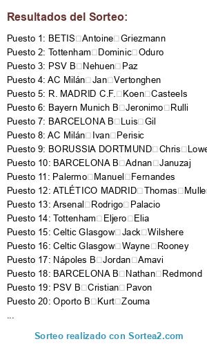 Lista de participantes: AC Milán Ivan Perisic, AC Milán Tim Krul, AC Milán Kevin Mirallas, AC Milán Bojan Krkic, AC Milán Fabricio Coloccini, AC Milán Cesar Azpilicueta, AC Milán Donis Avdijaj, AC Milán Mauro Zarate, AC Milán Younés Kaboul, AC Milán Jan Vertonghen, AC Milán Soldado, AC Milán Ashley Cole, AC Milán Andrés Guardado, AC Milán Sven Bender, AC Milán Asmir Begovic, AC Milán Nacho Monreal, AC Milán Nani, AC Milán Rafael Silva, AC Milán Kevin Volland, AC Milán Jeremy Mathieu, ACF FIORENTINA Kevin Strootman, ACF FIORENTINA Juan Bernat, ACF FIORENTINA Cristian Zapata, ACF FIORENTINA Aritz Aduriz, ACF FIORENTINA Claudio Bravo, ACF FIORENTINA Bernardo Espinosa, ACF FIORENTINA Leroy Fer, ACF FIORENTINA Heung-Min Son, ACF FIORENTINA Lora, ACF FIORENTINA Roberto Firmino, ACF FIORENTINA Franck Ribery, ACF FIORENTINA Roman Burki, ACF FIORENTINA Naldo, ACF FIORENTINA Thiago Motta, ACF FIORENTINA Dani Parejo, ACF FIORENTINA Danilo, ACF FIORENTINA Aymeric Laporte, ACF FIORENTINA Maxime Gonalons, ACF FIORENTINA José Callejón, ACF FIORENTINA Mario Mandzukic, ACF FIORENTINA Aleix Vidal, ACF FIORENTINA Alexandre Lacazette, ACF FIORENTINA B Jorge Mere Perez, ACF FIORENTINA B Pablo Perez, ACF FIORENTINA B Gabriel Castellon, ACF FIORENTINA B Borja Lopez, ACF FIORENTINA B Frederik Sorensen, ACF FIORENTINA B Godfred Donsah, ACF FIORENTINA B Pedro Obiang, ACF FIORENTINA B Iuri Medeiros, ACF FIORENTINA B Anthony Martial, ACF FIORENTINA B Dani Ndi, ACF FIORENTINA B Yossuf Poulsen, ACF FIORENTINA B Timo Horn, ACF FIORENTINA B Jonathan Tah, ACF FIORENTINA B Juan Muñiz, ACF FIORENTINA B Carlos Castro, ACF FIORENTINA B Fraser Kerr, ACF FIORENTINA B Alex Serrano, ACF FIORENTINA B Lass Bangoura, Arsenal Eliseu Pereira, Arsenal Daniel Agger, Arsenal Branislav Ivanovic, Arsenal Ricardo Quaresma, Arsenal Carlos Peña, Arsenal Aurelien Chedjou, Arsenal Nedum Onuoha, Arsenal Mohamed Salah, Arsenal Mubarak Wakaso, Arsenal Gianluigi Buffon, Arsenal Francesco Totti, Arsenal Didier Drogba, Arsenal Taison Barcellos Freda, Arsenal Mathieu Valbuena, Arsenal Rodrigo Palacio, Arsenal Marco Parolo, Arsenal Carlos Tevez, Arsenal Wesley Sneijder, Arsenal Felipe Melo, Arsenal Sergio Canales, Arsenal Oscar De Marcos, Arsenal Andre Ayew, Arsenal Rene Adler, Arsenal Christian Abbiati, ATLÉTICO MADRID Thomas Muller, ATLÉTICO MADRID Konstantine Rausch, ATLÉTICO MADRID Jonathan Dos Santos, ATLÉTICO MADRID Marcel Schmelzer, ATLÉTICO MADRID Nabil Fekir, ATLÉTICO MADRID Laurent Koscielny, ATLÉTICO MADRID Derick Tshimanga, ATLÉTICO MADRID Xabi Alonso, ATLÉTICO MADRID Wellington Silva, ATLÉTICO MADRID Alex Rodrigo Diaz da Costa, ATLÉTICO MADRID Karlsson Per, ATLÉTICO MADRID Tiago Cardoso Mendes, ATLÉTICO MADRID Jesus Corona, ATLÉTICO MADRID Philippe Coutinho, ATLÉTICO MADRID Aaron Ramsey, ATLÉTICO MADRID Thibaut Courtois, ATLÉTICO MADRID Arda Turan, ATLÉTICO MADRID Gervinho Yao, ATLÉTICO MADRID Fernando Torres, ATLÉTICO MADRID Vicente Guaita, ATLÉTICO MADRID Jose Manuel Fernandez, ATLÉTICO MADRID B Mickey Van Der Hart, ATLÉTICO MADRID B Momar N'Doye, ATLÉTICO MADRID B Hayden White, ATLÉTICO MADRID B Mamadou Tounkara, BARCELONA Ahmed Hassan, BARCELONA Carlos Vela, BARCELONA Jesus Gamez, BARCELONA Gary Cahill, BARCELONA Angel Di Maria, BARCELONA Simon Mignolet, BARCELONA Cristian Ansaldi, BARCELONA Konstantinos Manolas, BARCELONA Luis Suarez, BARCELONA Toni Kroos, BARCELONA Nicolas Gaitan, BARCELONA Aymen Abdennour, BARCELONA Yohan Cabaye, BARCELONA Cristian Eriksen, BARCELONA Carlos Darwin Quintero, BARCELONA Nicolas N'koulou, BARCELONA Granit Xhaka, BARCELONA Nathaniel Clyne, BARCELONA Stephane Ruffier, BARCELONA B Pione Sisto, BARCELONA B Marcos Lopes, BARCELONA B Jordan Lukaku, BARCELONA B Diego Reyes, BARCELONA B Horrit Hendrix, BARCELONA B Luis Gil, BARCELONA B Calum Chambers, BARCELONA B Adrien Rabiot, BARCELONA B Stefano Denswil, BARCELONA B Jesse Lingard, BARCELONA B Adnan Januzaj, BARCELONA B Nathan Redmond, BARCELONA B Joshua Kimmich, BARCELONA B Chuba Akpom, BARCELONA B Thorgan Hazard, BARCELONA B Josef Martinez, BARCELONA B Seko Fofana, BARCELONA B Youri Tielemans, BARCELONA B Raphael Guerreiro, BARCELONA B Julian Weigl, BARCELONA B Mory Kone, BARCELONA B Nicola Leali, BARCELONA B Mitchell Weiser, Bayern Leverkusen Victor Valdes, Bayern Leverkusen Arturo Vidal, Bayern Leverkusen Zacaria Labyad, Bayern Leverkusen Henrikh Mkhitaryan, Bayern Leverkusen Shinji Kagawa, Bayern Leverkusen Juan Manuel Mata, Bayern Leverkusen Alessio Cerci, Bayern Leverkusen Glen Johnson, Bayern Leverkusen Giuseppe Rossi, Bayern Leverkusen Joao Moutinho, Bayern Leverkusen Antonio Valencia, Bayern Leverkusen Marvell Wynne, Bayern Leverkusen Ruben Garcia, Bayern Leverkusen Tolga Zengin, Bayern Leverkusen Danny, Bayern Leverkusen Gonzalo Castro, Bayern Leverkusen Jerry Akaminko, Bayern Munich Lucas Moura Da Silva, Bayern Munich Ali Ahamada, Bayern Munich Gerard Deulofeu, Bayern Munich Ola John, Bayern Munich Javier Mascherano, Bayern Munich Talisca, Bayern Munich Diego Costa, Bayern Munich Pablo Zabaleta, Bayern Munich Mario Gotze, Bayern Munich Alexis Sánchez, Bayern Munich David De Gea, Bayern Munich Joel Matip, Bayern Munich Koke, Bayern Munich Alberto Moreno, Bayern Munich Keita Balde diao, Bayern Munich Stefan Savic, Bayern Munich Maarten Stekelenburg, Bayern Munich Gerard Pique, Bayern Munich Samuel Etoo, Bayern Munich Gaucho Ronaldinho, Bayern Munich Jordi Alba, Bayern Munich B Ruben Vezo, Bayern Munich B Bruno Zuculini, Bayern Munich B Denis Suarez, Bayern Munich B Jean Marie Dongou, Bayern Munich B Frank Bagnack, Bayern Munich B Antonio Sanabria, Bayern Munich B Federico Vico Villegas, Bayern Munich B Edgar Ié, Bayern Munich B Theo Bongonda, Bayern Munich B Munir El Haddadi, Bayern Munich B Kelechi Iheanacho, Bayern Munich B Felipe Augusto, Bayern Munich B Joao Cancelo, Bayern Munich B Gerard Gumbau, Bayern Munich B Jesus Vallejo, Bayern Munich B Ivan Cavaleiro, Bayern Munich B Adama Traore, Bay