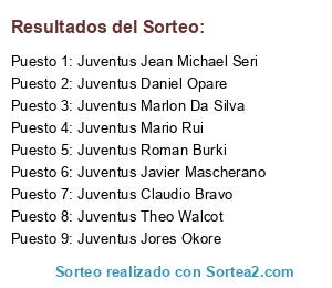 Lista de participantes: Juventus Bastian Schweinsteiger, Juventus Benoit Tremoulinas, Juventus Thiago Mota, Juventus Roque Mesa, Juventus Daniel Opare, Juventus Mario Rui, Juventus Juanfran Torres, Juventus Bernardo Silva, Juventus David Villa, Juventus Claudio Bravo, Juventus Jores Okore, Juventus Iago Aspas, Juventus Roman Burki, Juventus Theo Walcot, Juventus Javier Mascherano, Juventus Wesley Sneijder, Juventus Jonathan Biabiany, Juventus Jose Giménez, Juventus Martin Cáceres, Juventus Naldo, Juventus Wayne Rooney, Juventus Marlon Da Silva, Juventus Jean Michael Seri, Juventus Gerard Deulofeu, Juventus Mario Mandzukic.