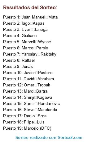 Lista de participantes: Bayer Leverkusen Marc Bartra, Bayer Leverkusen Jonas, Bayer Leverkusen Steve Mandanda, Bayer Leverkusen Shinji Kagawa, Bayer Leverkusen Yaroslav Rakitsky, Bayer Leverkusen Giuseppe Rossi, Bayer Leverkusen Omer Tropak, Bayer Leverkusen Marcelo (DFC), Bayer Leverkusen Darijo Srna, Bayer Leverkusen Ever Banega, Bayer Leverkusen Raffael, Bayer Leverkusen Marco Parolo, Bayer Leverkusen Samir Handanovic, Bayer Leverkusen Giuliano, Bayer Leverkusen Filipe Luis, Bayer Leverkusen Iago Aspas, Bayer Leverkusen Victor Valdes, Bayer Leverkusen David Abraham, Bayer Leverkusen Marvell Wynne, Bayer Leverkusen Juan Manuel Mata, Bayer Leverkusen Javier Pastore.