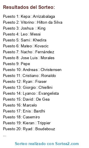 Lista de participantes: Nacho Fernández, Pepe, Kepa Arrizabalaga, Sami Khedira, Kieran Trippier, Casemiro, Giorgio Chiellini, Toni Kroos, Jose Luis Morales, Cristiano Ronaldo, Mateo Kovacic, André Silva, Ryan Fraser, Hector Bellerin, Marcelo, Ryad Boudebouz, Leo Messi, Lyanco Evangelista, Andreas Christensen, Enis Bardhi, Vitorino Hilton da Silva, Joshua King, David De Gea.